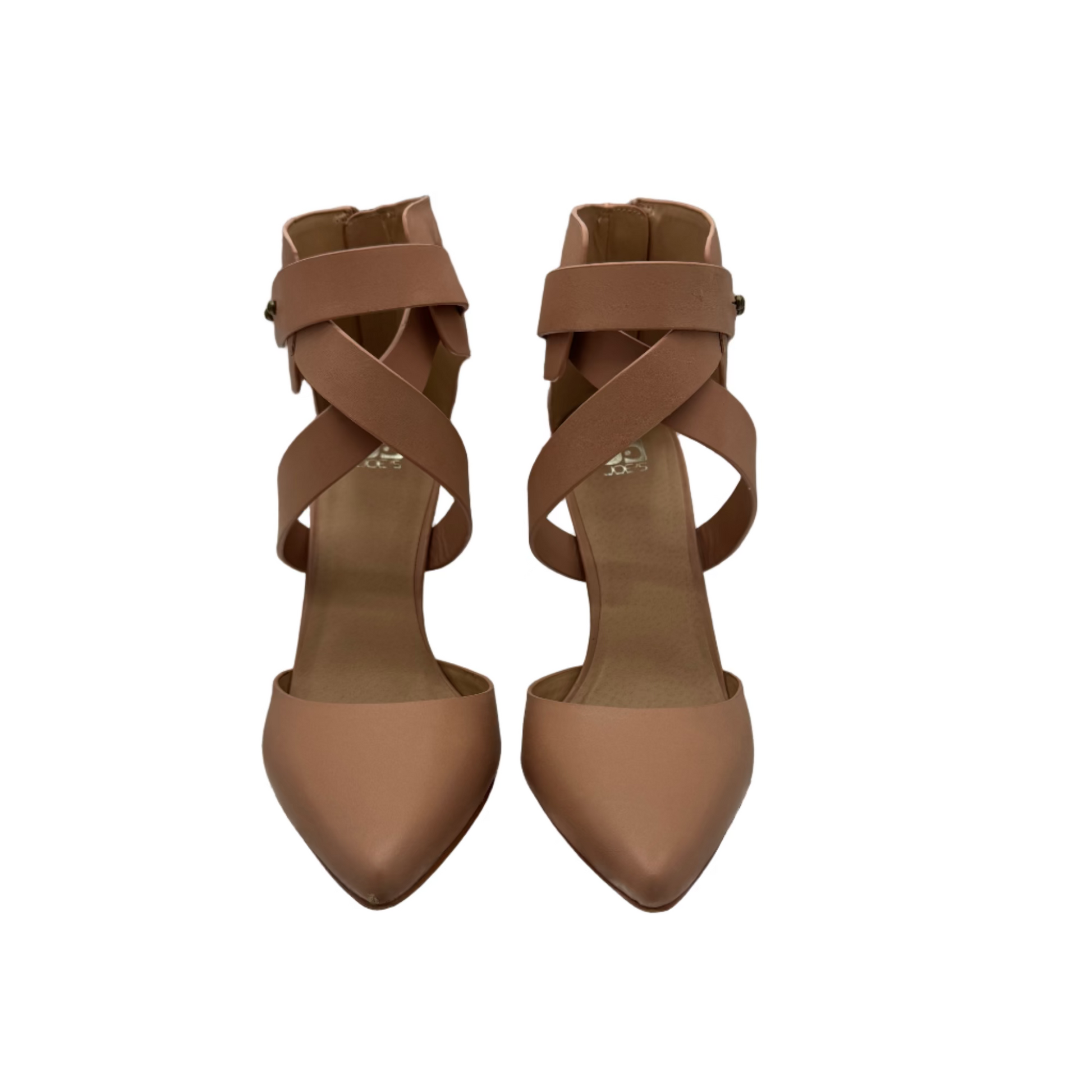 Nude, pointed toe heel, with criss-cross ankle strap and 4 in heel