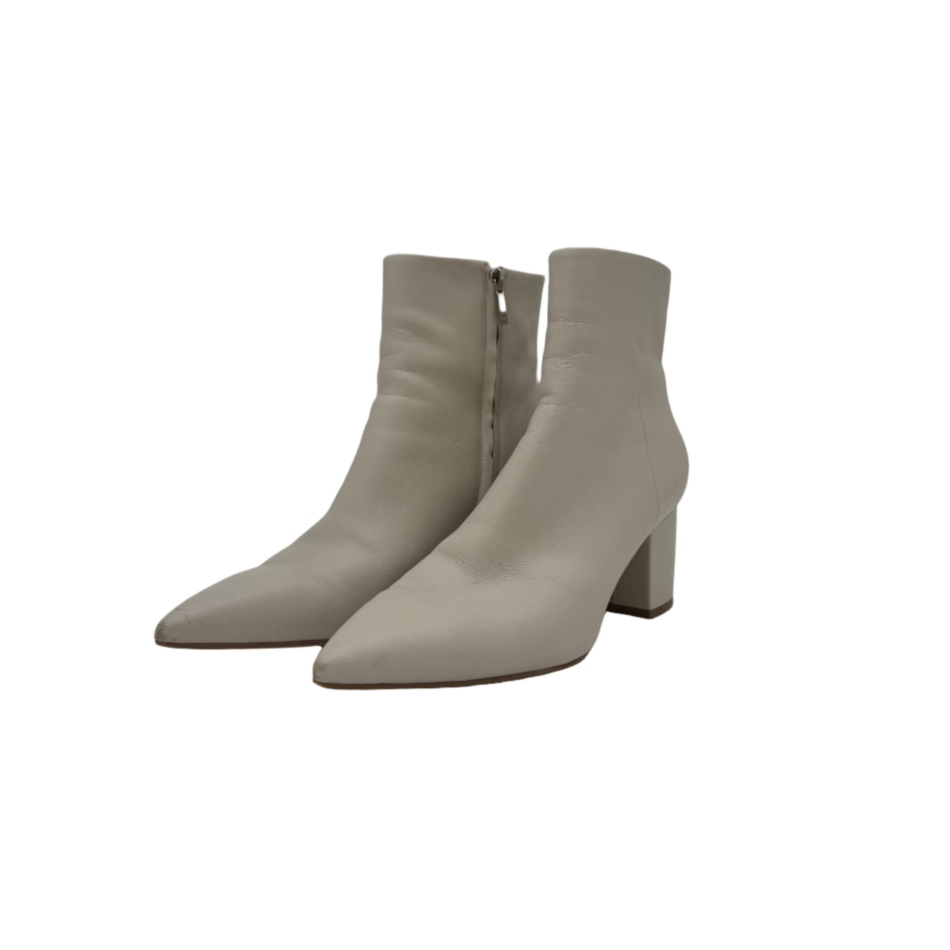 Cream colored MF bootie with side zip, block heel, and pointed toe